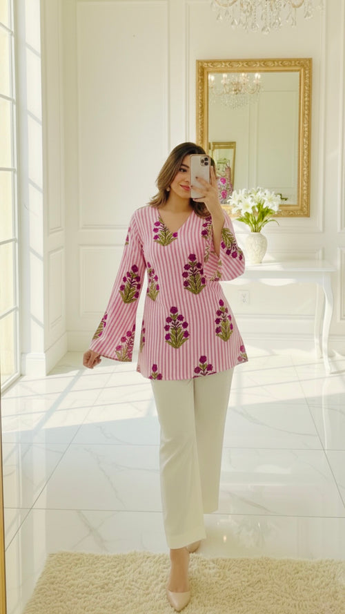 Experience traditional craftsmanship with our Hand Block print co-ord set, hand-printed in Jaipur. This set features intricate hand block designs, celebrating the rich heritage of block printing.